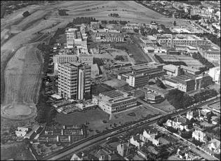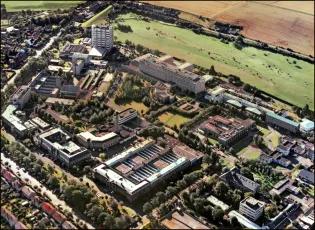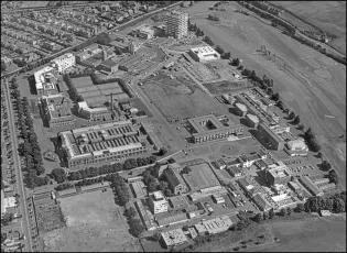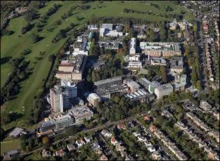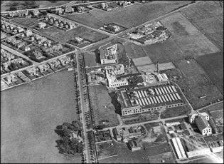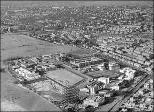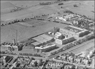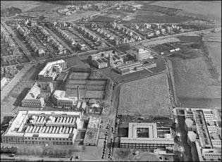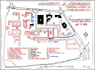 A brief history of the development of The King's Buildings campus during its first century. The exhibition consists of a series of aerial photographs of King's Buildings from 1920 onwards. Alongside each image we have included a brief description of the work undertaken at that time, showing how the campus has evolved over the last one hundred years.The information panels below can also be seen at King's Buildings, mounted at the side of the path between the Nucleus Building and the Mary Brück Building. The information panels at King's Buildings A brief aerial history of The King's Buildings campus The 115 acres of West Mains Farm, shortly before being purchased by the University in 1919. The main farm buildings (top, centre) will remain on the site for some years, and West Mains House (top) will sit opposite the campus until well into the 1970s.By the beginning of the twentieth century the rapid expansion of science facilities in the Old College and surrounding premises had reached a critical point, relieved only temporarily by the removal of Mathematics to Chambers Street, and Agriculture and Forestry to George Square.The Chemistry laboratories in the College had become hopelessly inadequate, and plans for a new Department of Chemistry in High School Yards had been abandoned at the outbreak of war in 1914. The Departments of Engineering and Geology were also seriously short of space in the centre of town, and new laboratory and experimental facilities were urgently required. The newly instituted Chair of Zoology in 1919 was also a trigger for expansion, requiring new accommodation.Undergraduate teaching had taken place since 1894 at the Royal Observatory on Blackford Hill in the south of the city, and in 1919 the nearby West Mains Farm (opposite) was purchased by the University for the relocation and expansion of its science departments, with an initial emphasis on Chemistry, Zoology and Geology. 90 acres of the 115-acre site were set aside for development, the remainder being leased to the Craigmillar Golf Club.Site preparation for the new Chemistry building began in November 1919. 1920: A formal birth... King George V, who had endorsed the University's appeal for funding for its new buildings, delivers a speech behind the initial brick construction for the new Department of Chemistry building, at the ceremony for the laying of the foundation stone for what have become known as "The King's Buildings", at West Mains campus.Queen Mary and various other dignitaries are also in view (the visit is taking place as part of the Royal couple's wedding anniversary), and the ceremony takes place in an Edinburgh downpour. The Edinburgh Evening News reports: "For the complete success of the event sunshine and warmth were needed. To-day was east-windy, cold, wet; Edinburgh was in her most ungenial aspect; she was, indeed, Tennyson’s 'grey Metropolis of the North'."As part of the ceremony, the King gives his permission to use his name collectively for the science laboratories; at 2pm on the 6th of July 1920, The King’s Buildings campus officially comes into existence.The foundation stone can be seen in this image, soon to be embedded in the main corridor of what will later be called the Joseph Black Building. 1921: The seeds of a new campus Construction of the new Chemistry building is underway in this earliest known aerial image of the campus, from which the southern section has still to be leased to the Craigmillar golf club. Buildings from West Mains steading are still on the site (to the left), while the surrounding residential areas have yet to appear. The boiler house chimney is the oldest structure on campus, pre-dating the opening of the Chemistry facility.One objection to the King's Buildings site is its perceived remoteness from the central University campus, although its separation from the city's grime and poor air is seen by others as a distinct advantage.The new building's innovative layout is based on ideas by department head James Walker, whose foresight has been to design a facility with teaching rooms interspersed with numerous research laboratories. It shares many features of industrial buildings, including the north-lit saw-tooth roof and large windows to provide adequate illumination. Walker has also eschewed the use of elaborate building materials – most of the structure is constructed from red brick – preferring to spend the money on internal features. His split design, with the second floor to be built later, is much criticised at the time; the wisdom of this decision will be recognised in later years.Once the first phase of the building is complete and opened for teaching in 1922, Chemistry will be the only working department on campus; almost seven years will pass before it is joined by any other science facility. 1929: The campus expands Looking south over an empty, tree-lined West Mains Road, we see that Chemistry has been joined by the recently opened Zoology building at the corner of Mayfield Road. Its construction has been the subject of great debate: many influential voices – including that of James Ashworth – argued against the move to West Mains.The building has been built with many innovative features, including large laboratory windows, and an extensive museum has been incorporated into the structure. The exterior is lavishly decorated with a series of sculptured panels executed by Phyllis Bone, depicting a range of animals in bold relief.The new Institute of Animal Genetics facility – later to be occupied by GeoSciences – is almost complete, and outbuildings for sheep, pigs and chickens lie to its north-west, including the long hut ("The Piggery") that will later be a home for the Faculty Office.Old YMCA huts, which formerly housed wartime American soldiers in St. Andrews Square, are now in temporary use by the Department of Geology and the student union, next to the Chemistry Building. (Click on the link below to see a picture of the huts in thei
